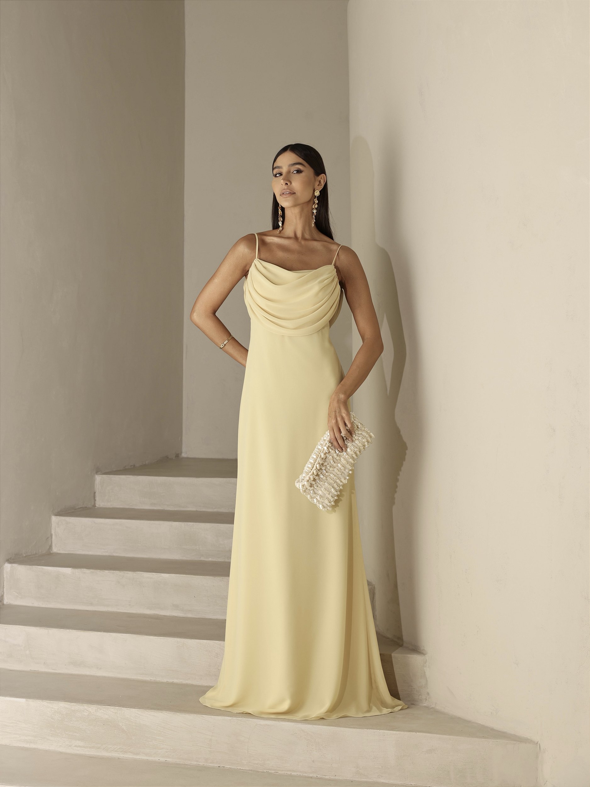 O Vestido Maite possui alças finas ajustáveis e delicadas que trazem leveza ao visual e um drapeado elegante tanto na parte frontal quanto nas costas. O detalhe especial fica por conta da parte traseira, que apresenta um decote profundo com acabamento em calda fluida, criando um movimento sofisticado e cheio de charme a cada passo. Confeccionado em tecido leve, o Crepe Silk tem toque macio ecaimento impecável, garantindo conforto durante todo o uso. O toque suave do material, aliado ao acabamento refinado, valoriza o corpo sem perder a naturalidade e fluidez.